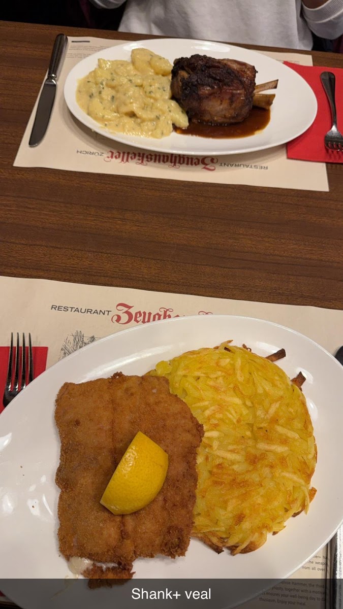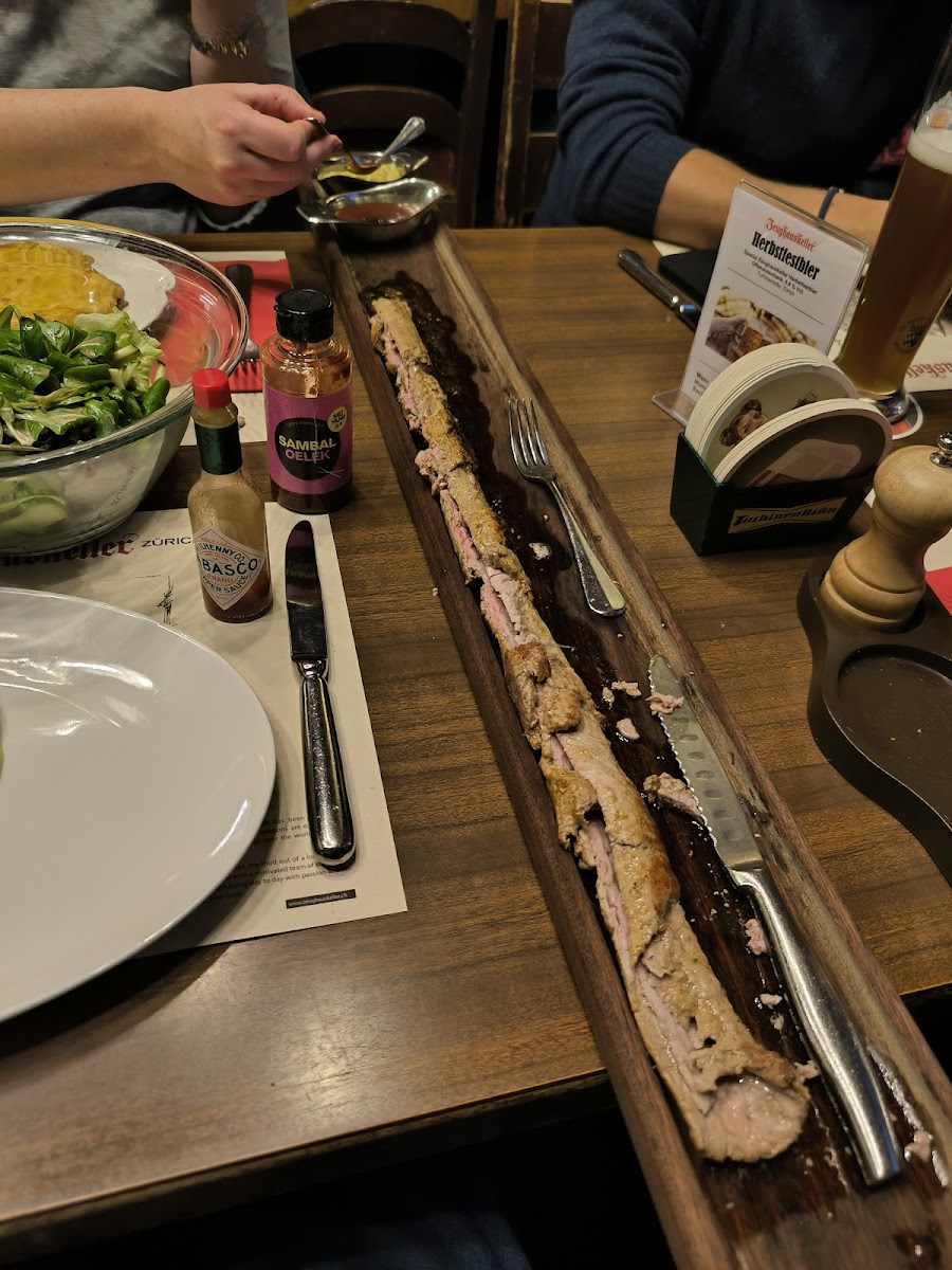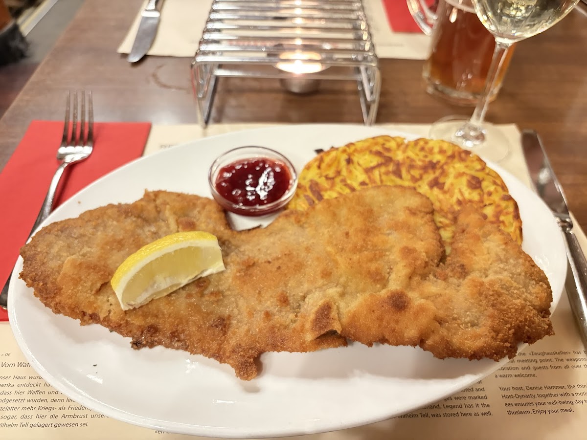 Typical Swiss restaurant, very big but very crowded. Highly recommend to book in advance. Reasonable prices for Swiss standards. We ordered assorted sausages with potato salad and onion sauce, and a schnitzel. Both were very tasty.